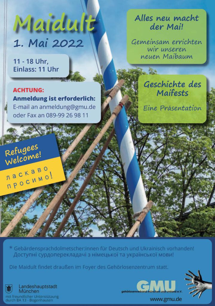 Maidult am 1. Mai 2022 von 11 bis 18 Uhr im Foyer des Gehörlosenzentrums. Abmeldung erforderlich unter anmeldung@gmu.de.