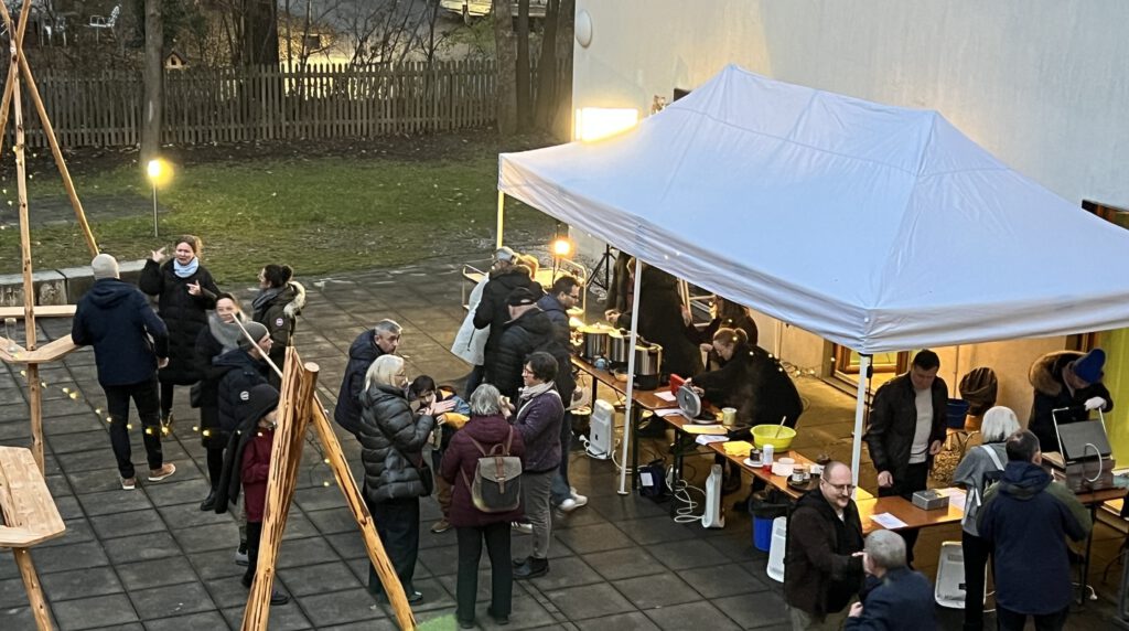 Mit Einbruch der Dunkelheit wurde es richtig adventlich: Der Duft von Glühwein, Kinderpunsch und leckerem Essen erfüllte das Gelände. Neben Glühwein und Kinderpunsch wurde auch heißer Aperol angeboten. Für das leibliche Wohl sorgten Kuchen, frische Waffeln und gegrillte Sandwiches. Auch schöne weihnachtliche handgemachte Sachen standen zum Verkauf bereit. Lichter und Dekorationen schufen eine gemütliche Stimmung. Überall gab es lebendige Unterhaltungen und ein freudiges Wiedersehen.