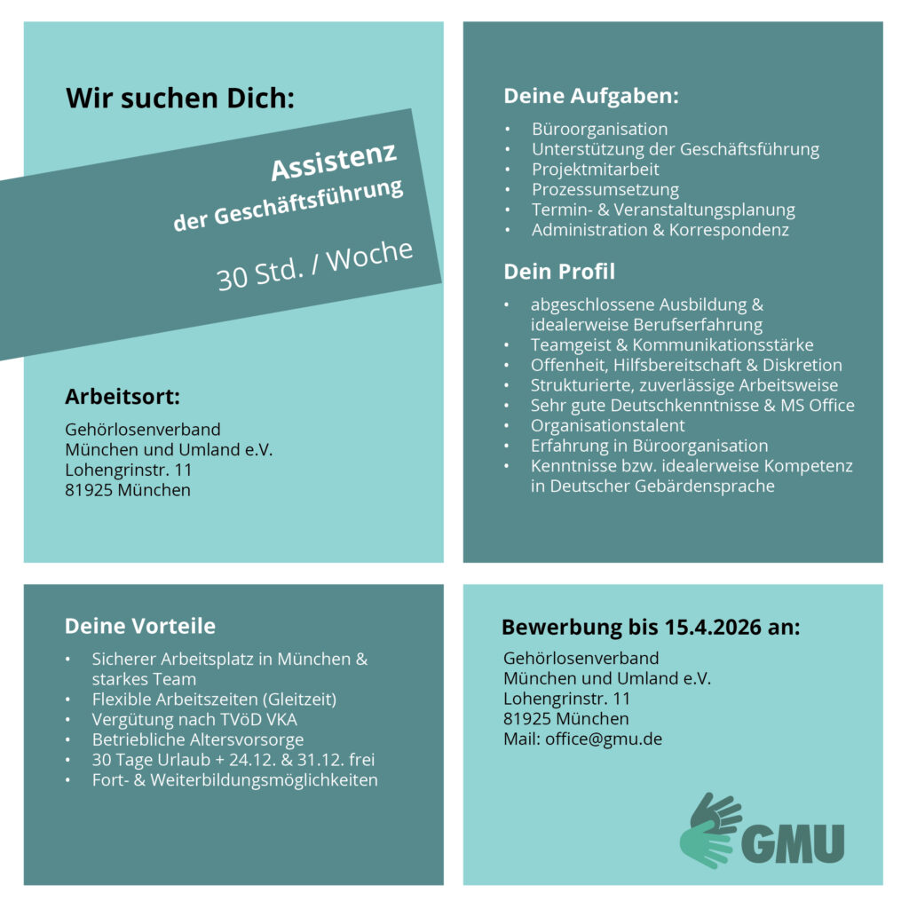 Der Gehörlosenverband München und Umland e.V. (GMU) sucht ab dem 01.05.2026 oder später eine Assistenz der Geschäftsführung (m/w/d) in Teilzeit mit 30 Wochenstunden.